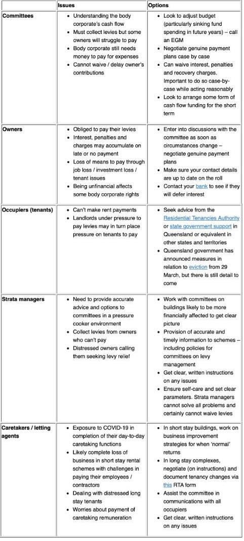 In the midst of the COVID-19 pandemic, the strata sector is facing some big issues. Perhaps the biggest challenge (this week at least) is how to manage body corporate levies and other financial issues at a time when people are under all sorts of financial pressure. It can be hard enough to get people to pay strata levies when they have the money, let alone when they do not.